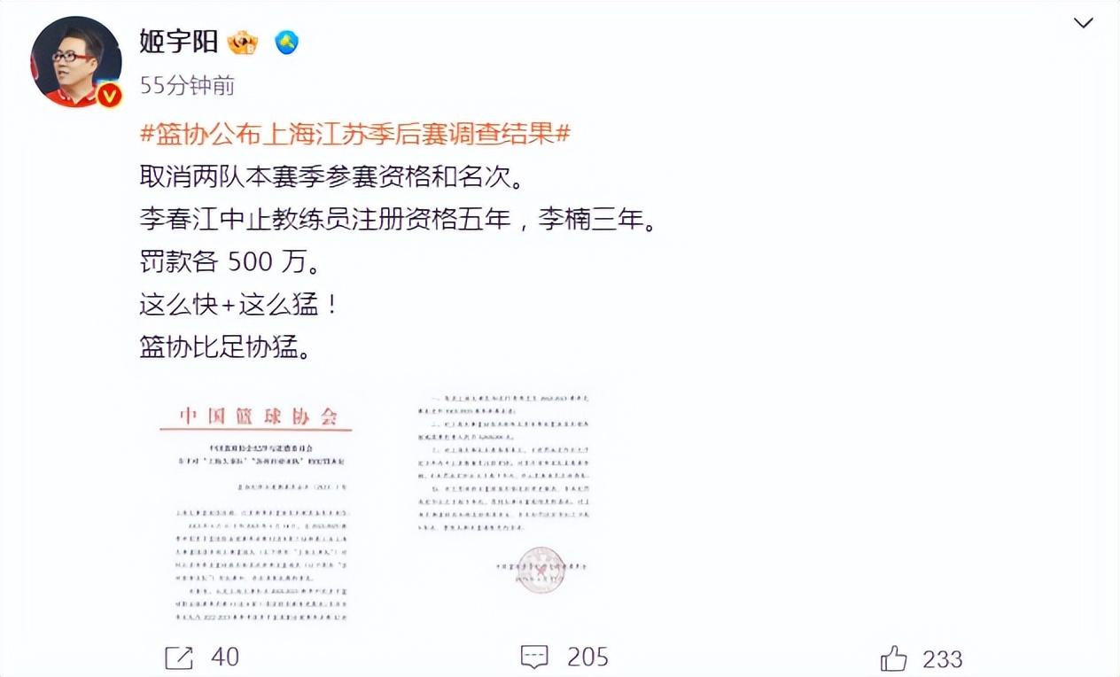 李春江中止教練員注冊資格五年,李楠三年。罰款各 500 萬。這么快+這么猛!籃協比足協猛。??”